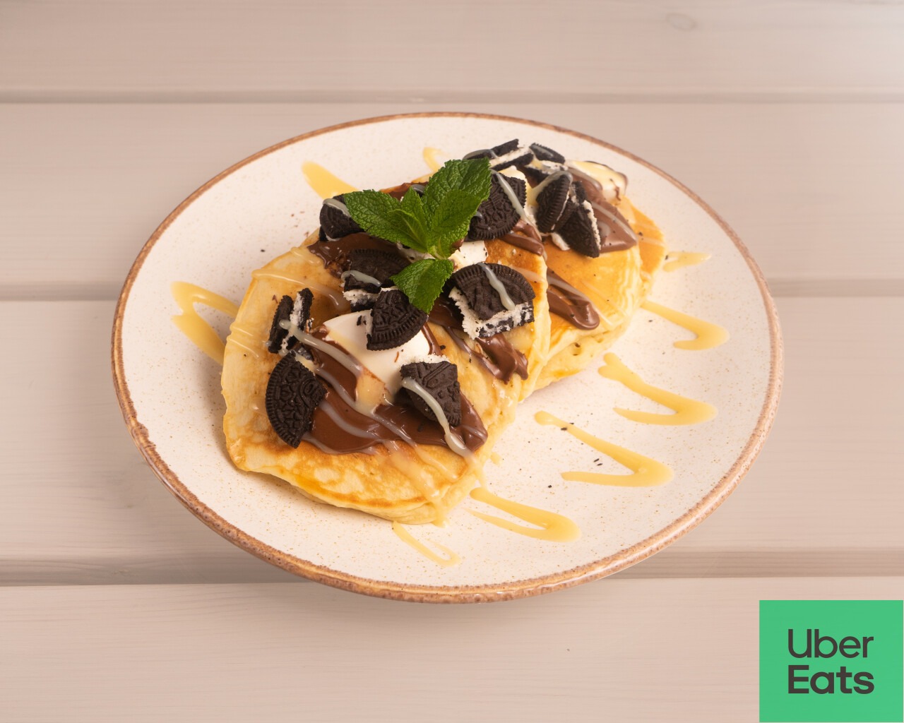 Pancake nr 6 konfitura porzeczkowa, serek homogenizowany, Oreo, sos biała czekolada