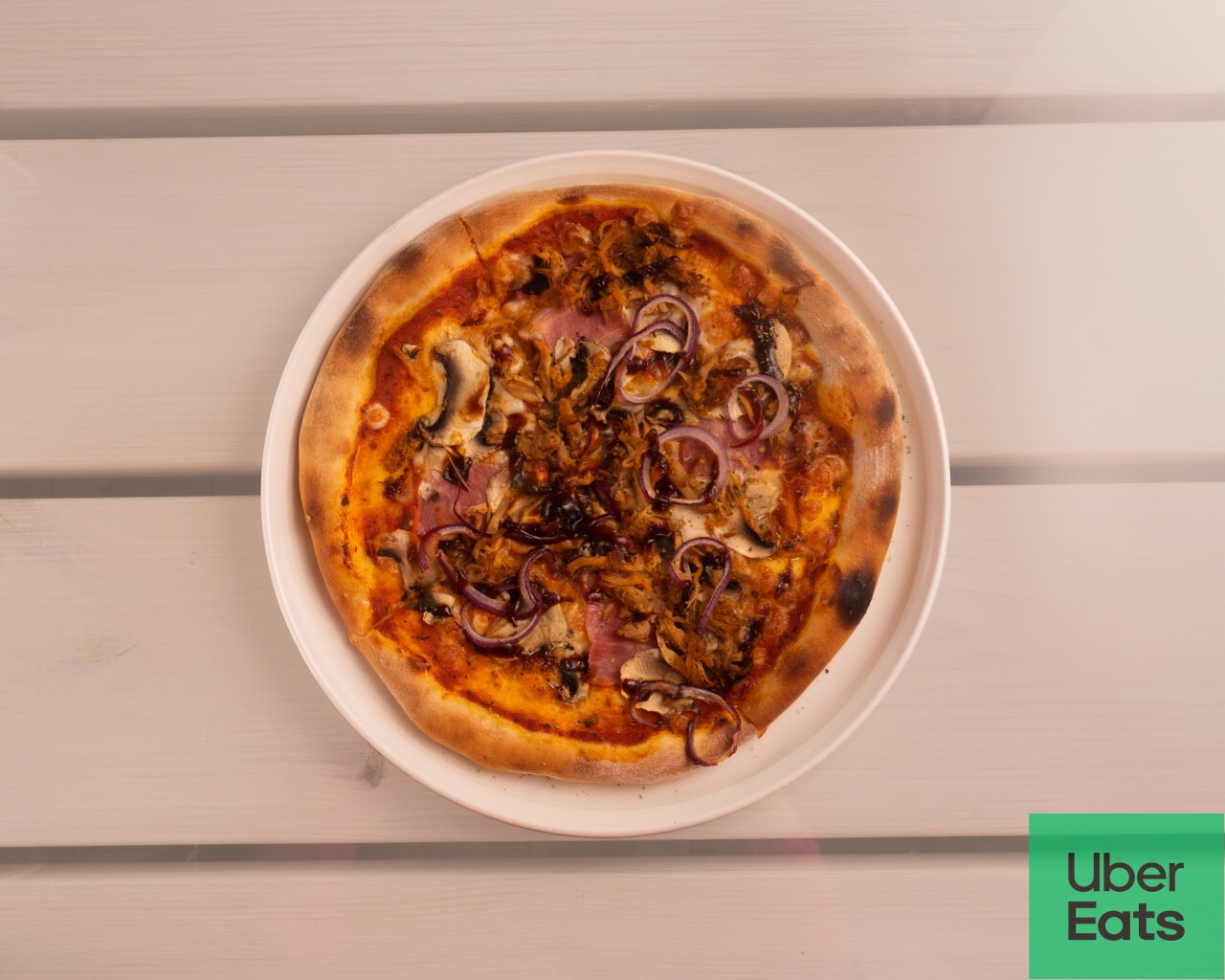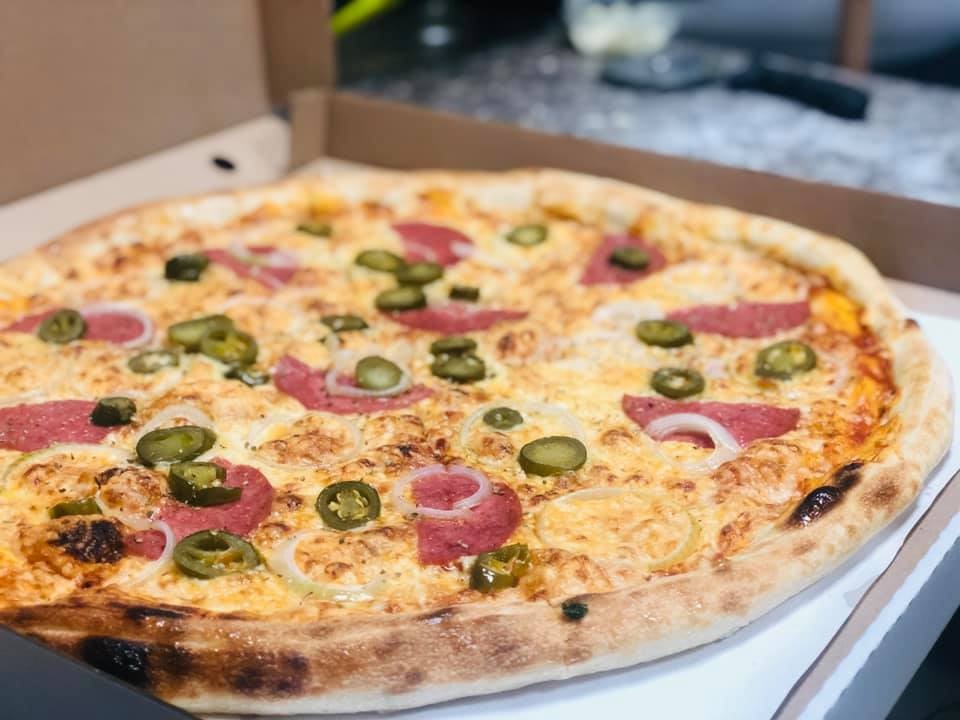 pizza na spodzie maślanym, boczek, cebula, czosnek, śmietana, szczypior ser żółty, boczek, cebula, ogórek konserwowy -